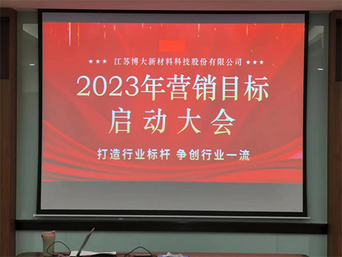 On February 3, 2023, Jiangsu Boda New Materials Technology Co., Ltd. held the 2023 marketing target launch conference, at which the new sales area division and responsible person were disclosed, the 2022 annual sales excellent team was praised, and the new marketing policies were explained. The New Year, the new atmosphere, the sales staff began to fight for their goals!